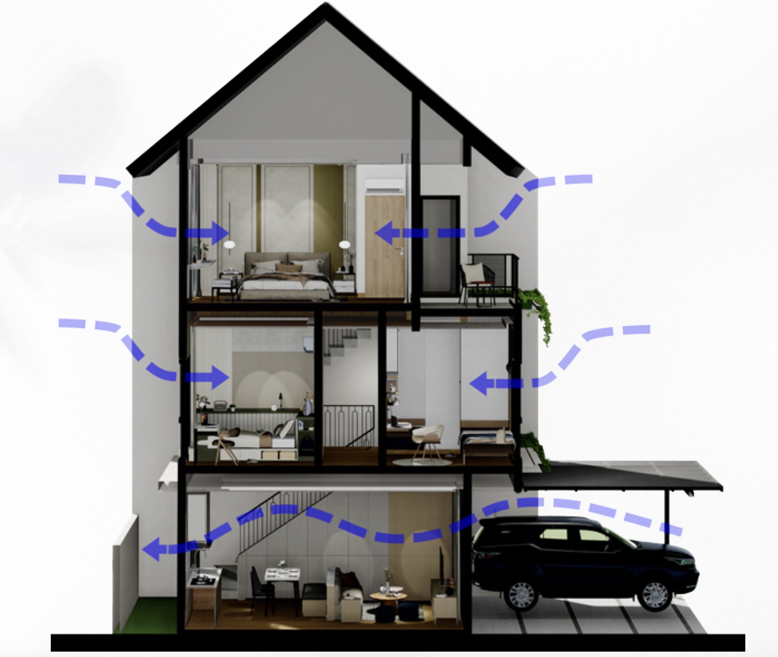 Desain rumah lebar 6 meter ini sangat cocok untuk keluarga modern yang menginginkan rumah dengan tata ruang fleksibel. Ruang tamu, dapur, dan area keluarga dirancang dengan konsep open-plan, yang memungkinkan aliran udara dan cahaya masuk dengan optimal ke seluruh bagian rumah. Selain itu, keberadaan sky garden atau balkon di lantai tiga menambah sentuhan alami, memberikan tempat untuk bersantai atau sekadar menikmati udara segar di tengah hiruk-pikuk kota.