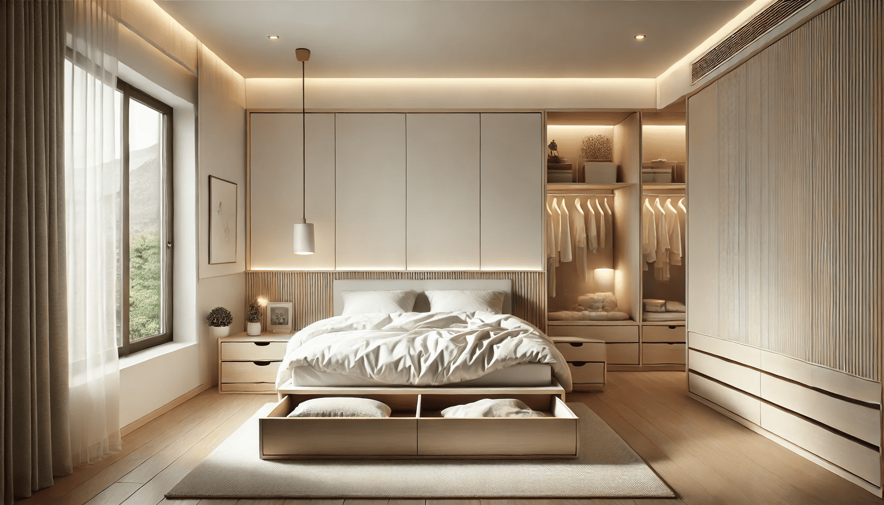 Dengan lebih sedikit distraksi visual dan lebih banyak ruang terbuka, kamar terasa lebih sejuk dan menenangkan. Hal ini sangat membantu ketika kamu ingin tidur lebih cepat dan nyenyak setelah seharian beraktivitas. Tidak hanya itu, dengan tempat tidur yang dirancang ergonomis dan menggunakan bahan yang nyaman, seperti kayu alami yang menenangkan atau kasur berkualitas tinggi, kamu bisa menikmati tidur malam yang lebih restorative.